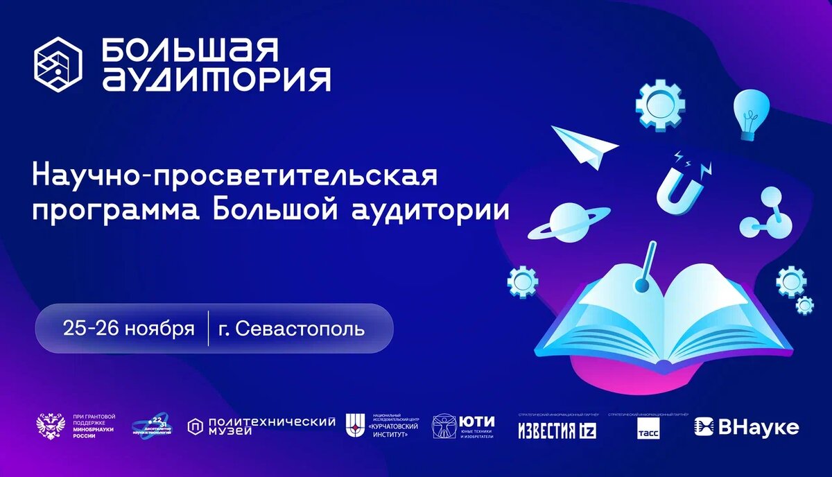 Приглашаем всех любителей науки и технологий принять участие в серии увлекательных лекций и викторин в рамках Научно-просветительского проекта Большая аудитория, которые состоятся 25 и 26 ноября 2024 года в Севастополе. 🗓 25 и 26 ноября 2024 года мы погрузимся в мир современных технологий и научных достижений: 25ноября, ул. Университетская, 33, аудитория 420: 🔸14:00–15:00 Лекция «Крылатый космос» с куратором экскурсионной деятельности Политехнического музея Николаем Чекановым. Узнаем о первых космических аппаратах, технологиях запуска и людях, сделавших космос достижимым! 🔸15:00–15:30 Викторина «Лаборатория крылатого космоса»: проверим свои знания о космонавтике и получим призы! Регистрация на лекцию «Крылатый космос», викторину «Лаборатория крылатого космоса» (https://forms.yandex.ru/u/672f3add73cee70c7e4e6642/) 26 ноября, ул. Гоголя, 14, актовый зал: 🔸10:00–11:00 Лекция «Что умеет автотехника?» с Николаем Чекановым. Поговорим о последних достижениях в автомобилестроении и их вли