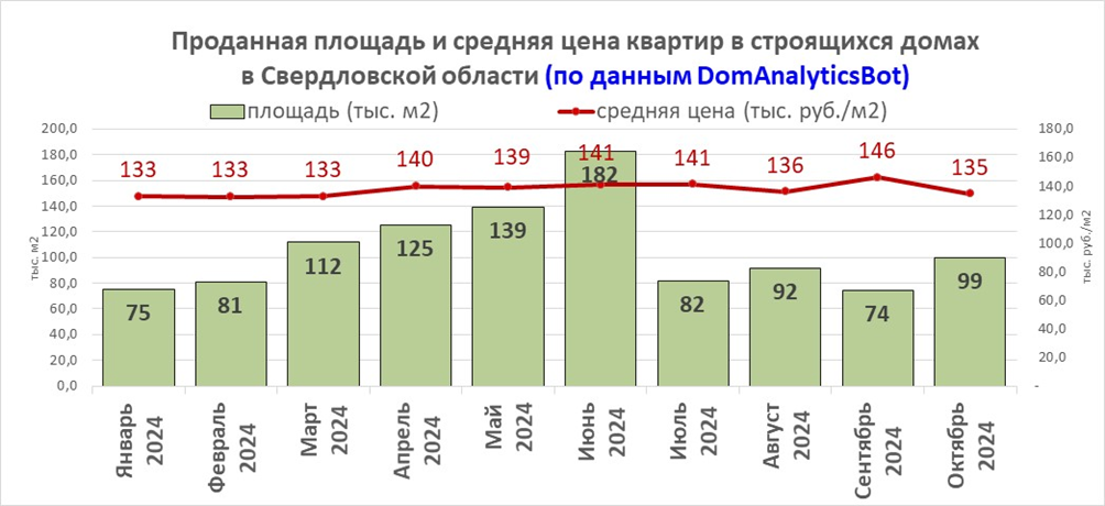В Свердловской области за октябрь продали на 34% больше жилой площади, чем в сентябре, но по-прежнему на 45,5% ниже пикового значения июня. Средняя цена за октябрь снизилась на 7,8%. Снижение цены объясняется существенной долей - 25,6% (доля сделок по ценам ниже рынка) сделок с крупными инвесторами или связанными с застройщиками компаниями.