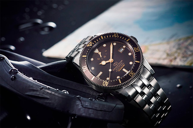 Юбилейная модель была сделана по мотивам легендарных дайверов Orient Calendar Auto Orient, которые были выпущены в далеком 1964 году. На этот раз новинка выполнена из чистого титана с элементами из настоящего золота.