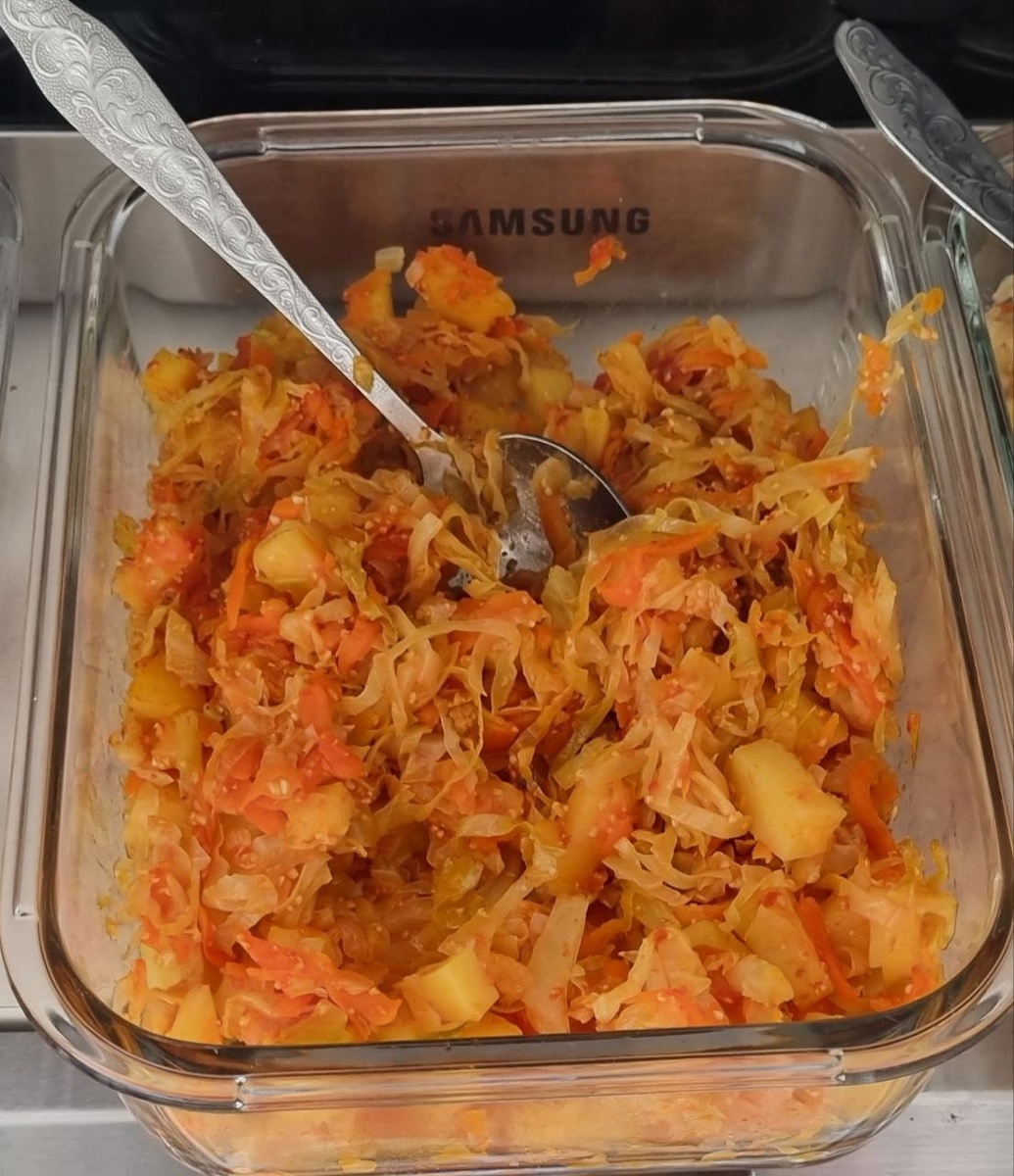 Капусту в таком виде я делаю с самого начала моей кулинарной деятельности))) С картошкой мне более сытно, с картошкой мне более вкусно, с картошкой мне более приятно по ощущениям))) В общем, начали: 1/2 маленького вилка капусты 1 большая морковь 1 луковица 3 картошины 200 г замороженной томатной смеси или помидоры в собственном соку Сухой чеснок - 1 ч.л. Соль, перец по вкусу Сливочное, топленое масло для припускания Лук мелко режем, морковь трем на крупной терке, капусту шинкуем тонкими полосками, картофель нарезаем мелкими брусочками. Лук томим на сливочном масле, добавляем морковь, "обжариваем", добавляем капусту, картошку, накрываем крышкой и тушим минут 10, добавляем помидоры, сухой чеснок, соль, перец, перемешиваем, закрываем крышку и тушим до готовности. Капуста даст сок, тем более еще и помидорный сок будет, поэтому в принципе воду не добавляем. Тушим на маааааленьком огне, периодически помешивая. Если видите, что начинает приставать, добавьте чуть воды. У меня раз на раз не п