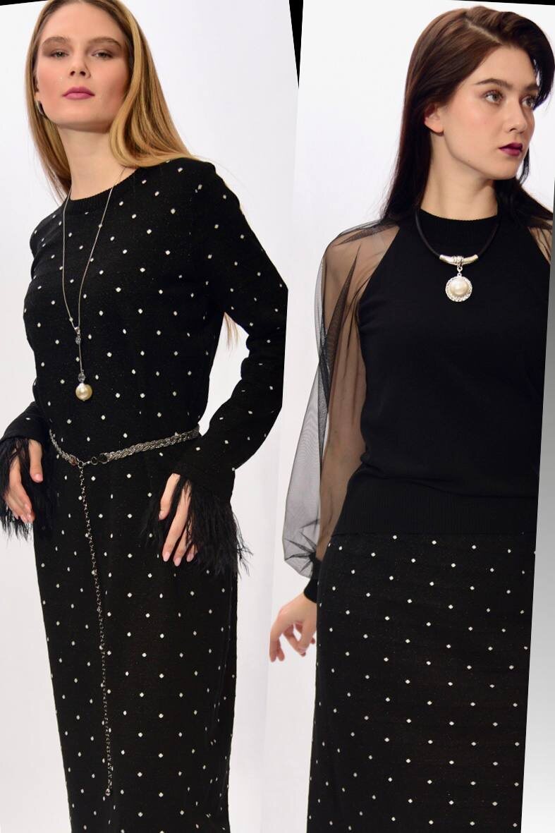 Это просто вверх милоты и женственности. Простая строгая форма прямого платья становится основой для фантазий и игры образов. Добавляем митенки с бахромой по рукавам, добавляем пояс - цепочку с жемчугом, длинные жемчужные серьги и получаем уже наряд для светского выхода. Ну а юбка карандаш в горошек, чуть зауженная внизу и правильной длины - это несомненно must have в любом гардеробе. ⚫️Добавьте к ней изящный джемпер с прозрачными рукавами, темные колготки и шпильки.. и секси образ торжествует Начинаем с самой интересной детали на джемпере. ➰Фигурная петля от стойки горловины офрмлена ВРУЧНУЮ! настоящими жемчужинами из кампании горошин на юбке. ️Джемпер из премиальной итальянской пряжи с шелком маленького объёма смотрится очень женственно. Юбка, как и все итальянские модели юбок-карандашей, совершенны по пропорциям длины и объёма. ➰Завуалированная секси! ⚪️Коллекция "Шанель" просто не возможна без ЖЕМЧУГА. У нас потрясающая подборка браслетов, сережек и конечно, подвесок с жемчугом.