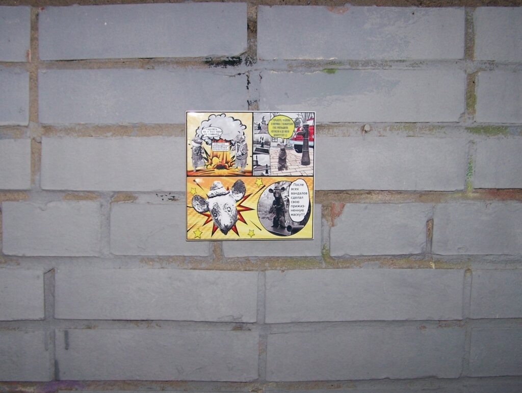 На своей странице в социальной сети Бэнкси Нижегородский опубликовал созданный им комикс о многострадальных грызунах. Плитку с историей о скульптурах на Почаине автор разместил на кирпичном доме на улице Богородского.