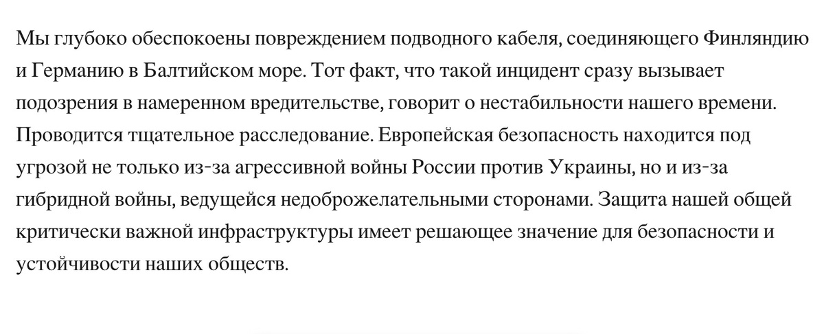 Как сообщает New York Times, министр обороны Германии Борис Писториус считает, что подводные кабели, соединяющие Финляндию и Германию, а также Литву и Швецию, были повреждены намеренно. Хотя интернет-связь между странами сохраняется, инциденты привели к серьезным сбоям. По словам Писториуса, вероятность того, что кабели могли быть случайно повреждены, крайне мала. Он заявил, что "никто не верит, что эти кабели были разорваны случайно", отметив, что якоря судов вряд ли могли нанести такой ущерб. Хотя министр назвал случившееся саботажем, он признал отсутствие конкретных доказательств на данный момент. Германия и Финляндия выпустили совместное заявление: В сентябре США предупреждали о возможном саботаже против подводных кабелей, указывая на увеличение активности российских военно-морских сил вблизи ключевых коммуникационных маршрутов. В прошлом году Швеция, Дания, Норвегия и Финляндия сообщали о подозрительных российских суднах, замеченных возле подводных кабелей и ветряных электростанци
