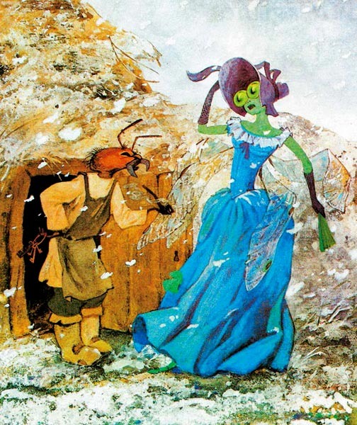 . Стрекоза приподнимает занавеску, смотрит на снег и вечер. Муравей отворачивается от окна. Стрекоза аккуратно заворачивает в фольгу остатки шоколадки. Фольга рвётся, коричневые крошки падают на белый стол. Книгу она оставляет и медленно идет в прихожую.