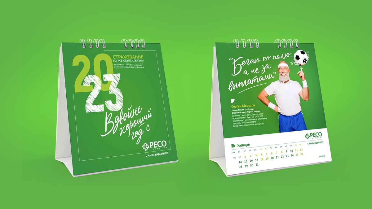 КЛИЕНТ И ЗАДАЧА «РЕСО-Гарантия» — один из лидеров страхового рынка, который работает с юридическими и физическими лицами и занимается страхованием на все случаи жизни. Клиент обратился к DS1 branding с задачей разработать концепт календарей для корпоративных подарков клиентам и партнерам. АНАЛИТИКА И ТРЕНДЫ Корпоративные подарки перестают быть простой формальностью и служат поддержкой связи между компанией и ее клиентами, партнерами, сотрудниками. Даже при выборе достаточно традиционного носителя, каким являются календари, подарок должен отражать ценности бренда и способствовать укреплению лояльности. Следуя тренду на сторителлинг и «очеловечивание», то есть переход от формализма к ценностям и живому языку, можно раскрыть через дизайн надежность компании и ее индивидуальный подход к клиентам. Еще одной актуальной тенденцией является функциональность — если подарок будет полезен, то аудитория не уберет его «в стол», а будет активно использовать, ассоциируя его практичность с самим бре