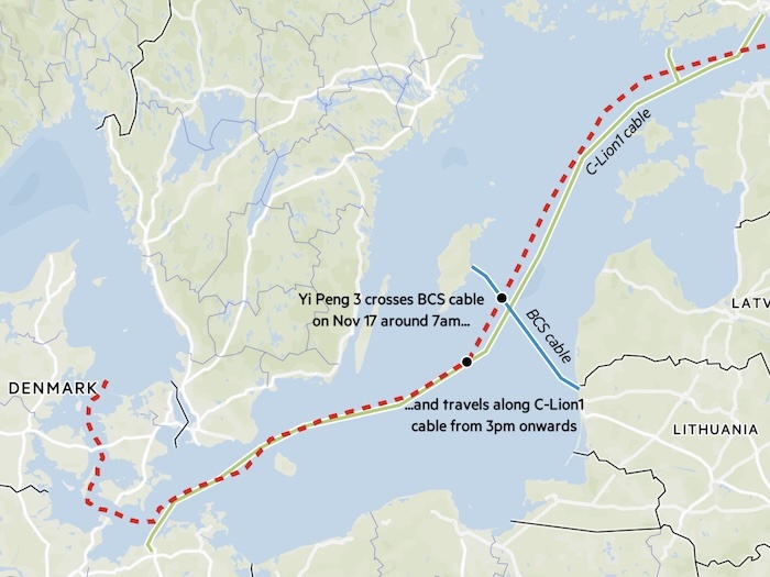 Следователи, занимающиеся обрывом двух кабелей передачи данных в Балтийском море, изучают перемещения китайского сухогруза. Европа проводит уже второе такое расследование за последние месяцы на фоне растущей напряженности в связи с возможным саботажем Маршрут китайского судна Yi Peng 3. Источник: The Financial Times Судно Yi Peng 3, зарегистрированное в Китае и следовавшее из российского порта Усть-Луга в Порт-Саид в Египте, прошло близко к шведско-литовским и финско-германским кабелям примерно в то время, когда они были повреждены. Об этом сообщает компания MarineTraffic, отслеживающая морской трафик. Эксперты по открытым источникам сообщили, что за грузовым судном впоследствии внимательно следил датский флот.Швеция начала расследование по обоим инцидентам и изучает, какую роль могло сыграть судно Yi Peng 3, сообщили люди, знакомые с расследованием. «Шведы тщательно изучают китайское судно», — сказал один из источников, знакомый с расследованием. Правительство Швеции отказалось коммен