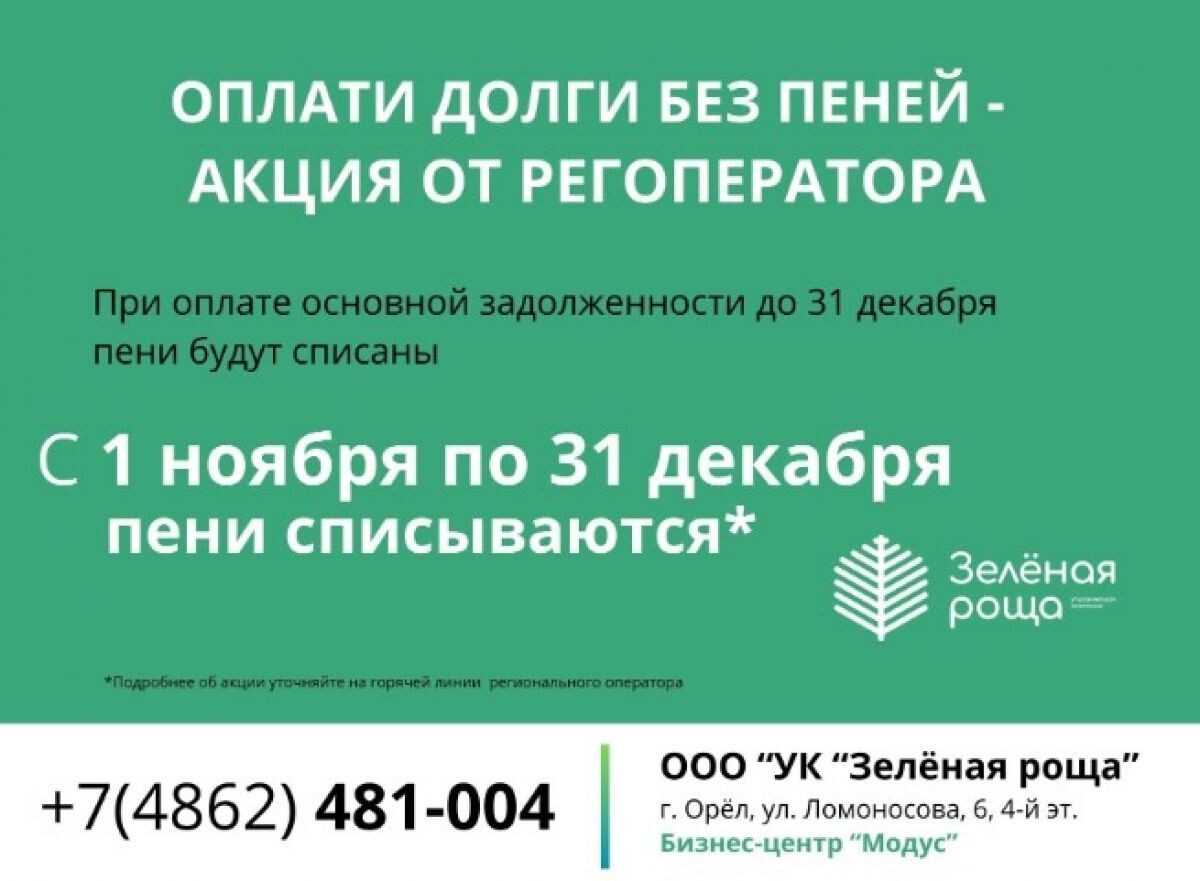 С 1 ноября по 31 декабря 2024 года ООО «УК «Зеленая роща» проводит акцию «Оплати долг без пени!», в рамках которой физические могут избавиться от начисленных пеней при погашении всей задолженности за вывоз ТКО. Чтобы принять участие в акции, физическим лицам нужно полностью оплатить долг и подать заявление о списании пеней.