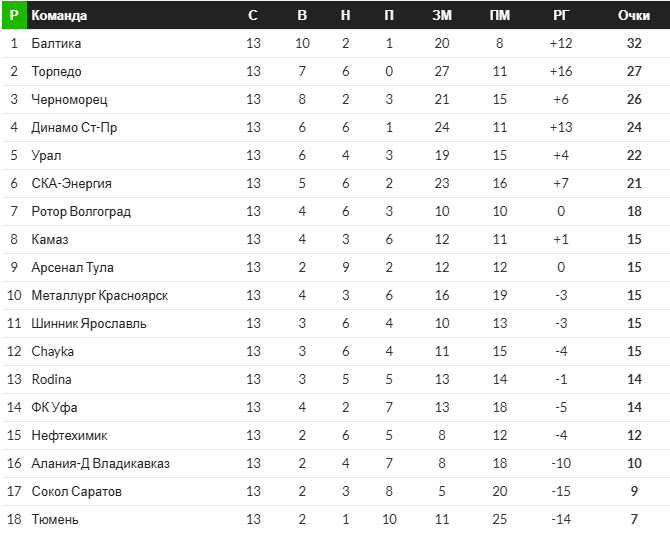 Балтика и Торпедо продолжают отрываться от пятого места. Сочи и Урал закрепляются в стыках.