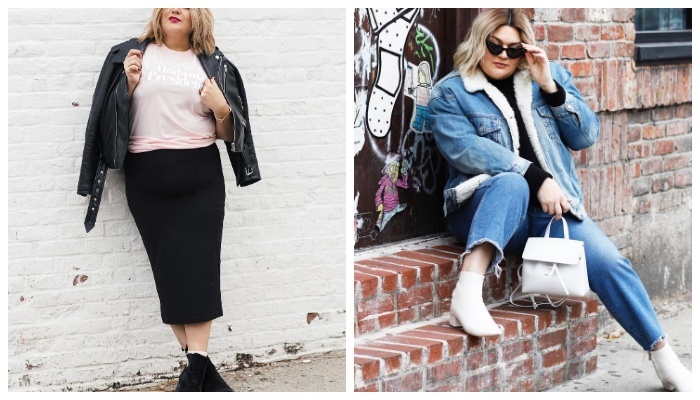 Чтобы создать стильный образ для красоток с пышными формами, нужно учитывать множество деталей. Сейчас мы рассмотрим конкретные примеры аутфитов, которые подойдут модницам плюс-сайз в холодное время года. Комбинация белой оверсайз рубашки, принтованного вязаного жилета, кожаных лосин и эффектных ботильонов на массивном каблуке, изготовленных из кожи и украшенных шнуровкой, является первым вариантом стильного образа с модными вещами, которые изумительно смотрятся на женщине с пышными формами. Стилисты любят экспериментировать с принтованными вещами, получая в результате всегда идеальные образы. На этот раз гуру моды выбрали черную рубашку в контрастную белую клетку, черные брюки скинни и высокие замшевые ботфорты универсального бежевого оттенка. Верхним слоем в данном образе служит черно-белое пальто в клетку среднего размера. Уютный осенний look для барышень plussize стилисты составили с помощью оверсайз кашемирового свитера с высокой горловиной карамельного цвета, коричневых лосин, а