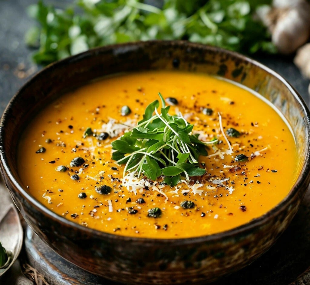 Здравствуйте дорогие читатели,сегодня мы вам расскажем как готовить один из самых интереснейших и вкуснейших суп-пюре. Приготовление данного суп-пюре занимает около 40 минут. Калории: 27 Ингредиенты: Яблоко зелёное - 200 г Тыква мускатная - 200 г Розмарин - 1 веточка Соль - по вкусу Перец черный молотый - по вкусу Тимьян - 1 веточка Масло оливковое - 50 мл Чеснок - 1 зубчик Лук репчатый - 50 г Масло сливочное - 30 г Бульон - 400 мл Сыр пармезан - 30 г Микрозелень - 1 пучок Способ приготовления: Шаг 1: Яблоко зелёное - 200 г Тыква мускатная - 200 г Яблоко крупно нарежьте, удалите сердцевину. Тыкву нарежьте на крупные дольки. Шаг 2: Розмарин - 1 веточка Тимьян - 1 веточка Масло оливковое - 20 мл Чеснок - 1 зубчик Соль - по вкусу Перец черный молотый - по вкусу Выложите яблоки и тыкву на пергамент. Посолите, поперчите, добавьте розмарин, тимьян, нарезанный зубчик чеснока, оливковое масло и отправьте запекаться в духовку на 25 минут на 180 градусов. Шаг 3: Лук репчатый - 50 г