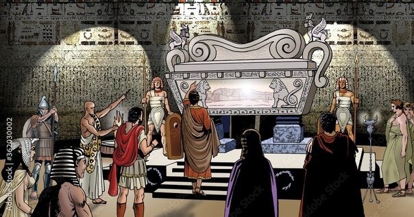 Я полагаю, что новый саркофаг Александра Македонского был изготовлен из стекла или алебастра, потому что обработка огромной хрустальной глыбы технологически невероятно сложна. Стеклянный гроб выглядел непревзойденным творением для того времени и достойным ложем как места упокоения величайшего полководца древности.