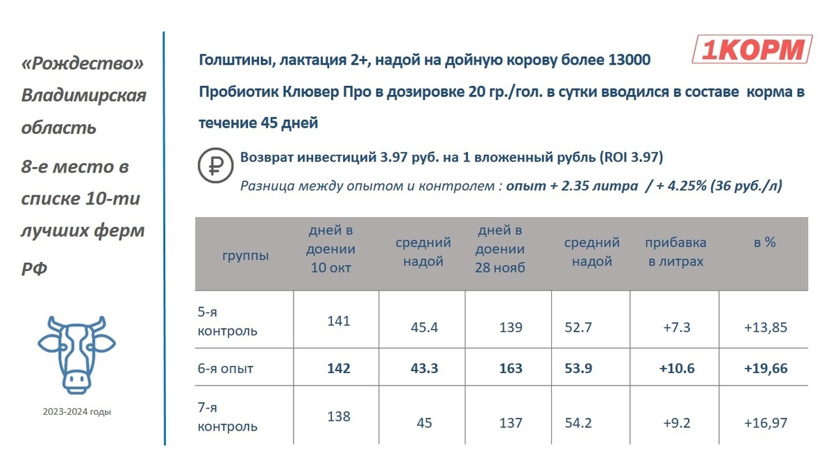 Введение живых дрожжей проходило на ферме «Рождество» в Владимирской области, которая занимает 8-е место среди 10 лучших ферм России. Эксперимент на голштинах продолжался 45 дней, такого срока хватает для оценки эффективности добавления живых дрожжей в корм КРС.