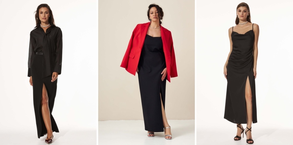 Рекомендуйте клиентам соблюдать баланс между открытыми и закрытыми элементами: так наряд с разрезом будет выглядеть эффектно и элегантно. Если на платье есть высокий разрез на бедре, лучше выбрать закрытый верх — например, с длинными рукавами или высоким вырезом. Это создаст гармоничный и одновременно загадочный образ.