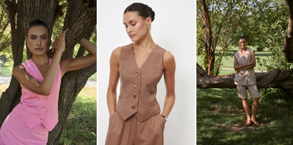 Среди актуальных моделей выделяются удлиненные жилеты с поясом, двубортные модели, а также укороченные версии, идеально подходящие для теплой весны. Преимущество жилета в его универсальности: он легко адаптируется под деловой стиль и повседневный, позволяя создать стильный лук на любой случай. Жилет удачно подчеркивает фигуру, особенно в сочетании с одеждой высокой посадки, визуально удлиняя силуэт и придавая образу завершенности.