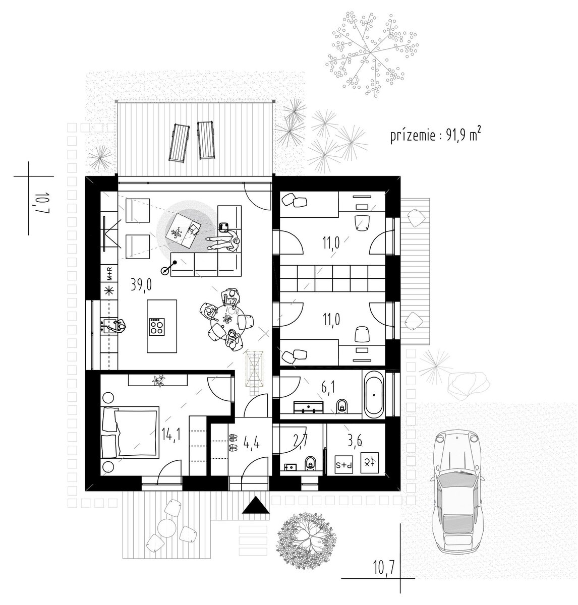 Полезная площадь этого дома составляет 91.9 м 2. Габариты дома и площадь каждого из помещений вы можете увидеть на плане: Здесь есть небольшая прихожая, но вместившая в себя нишу для шкафа или других систем хранения. Справа при входе мы можем попасть в санузел, который является проходным, а сразу за ним в техническое помещение. Ещё один санузел есть прямо по коридору. В доме есть три изолированных комнаты площадью: 14, 11 и 11 м2. И просторная кухня-гостиная 39 м2. Больше всего мне нравится компоновка кухни-гостиной, дизайнеры грамотно распределили все важные зоны и мебель в них. Несмотря на непримечательный внешний вид дом выглядит современно и минималистично. Это хорошо сказывается на итоговой стоимости дома. Также благоприятно сказывается на стоимости дома его простая квадратная форма и четырёхскатная кровля с уклоном 25 градусов. В доме есть одна несущая перегородка. Дом имеет 9 окон Два из которых достаточно большие. А все спальни имеют окна в пол. Конечно при желании или отс