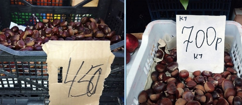 Ценообразование на тот или иной продукт порой не поддаётся никакой логике. Иногда продавцы пишут ценники «от балды», рассчитывая, что глупые покупатели, разогретые информационным ажиотажем о стремительном росте цен на всё, схватят залежалый товар без раздумий. Так, одни и те же каштаны в одной стороне Больших Исад стоят 450 рублей за кило, в другой – 700.