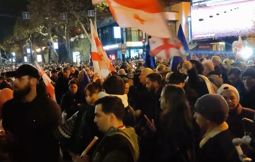 На кадрах протестующие с флагами Грузии и Евросоюза идут по улицам города, выкрикивая лозунги, а полиция патрулирует места проведения акции.