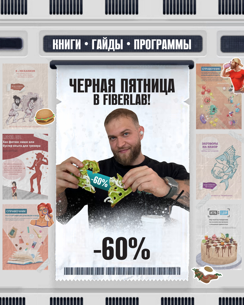 Не все мои подписчики знают, что кроме флагманского курса FiberLab Recomposition, за 10+ лет профессиональной деятельности я написал несколько книг и выпустил ряд продуктов, посвященных более узким вопросам питания и тренинга. Кроме того, значимая часть посвящена продвижению тренеров в онлайне и организации бизнеса — ведь я сам начинал с ведения клиентов в зале. Настало самое выгодное время, чтобы прокачать знания и повысить свою экспертность - для новичков в фитнесе, выступающих спортсменов и тренеров работающих с клиентами. 🔥 Начиная с сегодняшнего дня и до 30 ноября на все мои продукты впервые действует специальное предложение в честь Черной пятницы + возможность приобрести наборы продуктов на самых выгодных условиях. Повторение подобных условий возможно в следующую черную пятницу, в следующем году ;) 🔗 Переходи по ссылке и выбирай курсы по лучшей цене, чтобы прокачать себя и свои профессиональные навыки 💪
