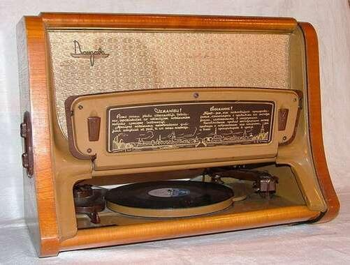 Радиола, как радиола, но особенная. У всех проигрыватель пластинок под верхней крышкой, здесь не так. Снизу как и у всех шкала приёмника с ручками настройки, громкостью. Но у этой радиолы она откидывается кверху, открывается отсек и в нём проигрыватель.