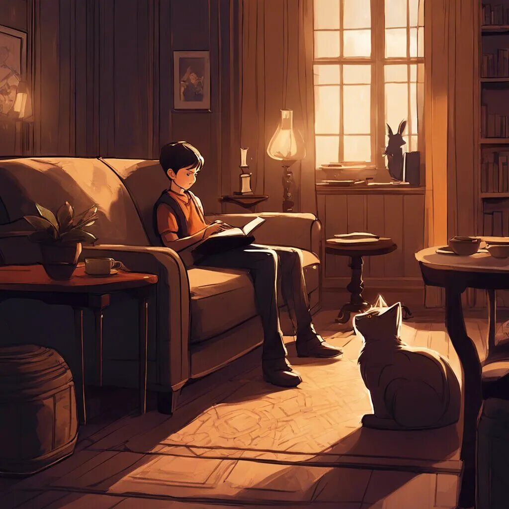 Ваня сидел на диване, скользя пальцами по шерсти кота, в то время как дед рассказывал очередную историю о бабушке. — Знаешь, Ванечка, бабушка всегда говорила, что в ночи можно услышать шёпот звёзд, если прислушаться, — начал дед, его глаза блестели в свете лампы. — Она верила, что они хранят наши мечты и секреты. Ваня любил эти рассказы. Они были полны тепла и чего-то такого, что напоминало ему о бабушке. Собака дремала на диване, мирно посапывая. Родители ушли в гости к соседям и должны были скоро вернуться. Постепенно дед замолчал и задремал в кресле, а Ваня продолжил играть с котом. Комната погрузилась в уютную тишину, нарушаемую лишь тиканьем часов. Но вскоре кот напрягся, соскочил с дивана и со шипением уставился в коридор. Собака встрепенулась и тихо зарычала. Ваня почувствовал, как что-то холодное пробежало по спине. Он встал и осторожно направился к деду, собираясь его разбудить. Подойдя ближе, он заметил, что дед сидит слишком спокойно. Ваня потряс его за плечо, но дед не реаг