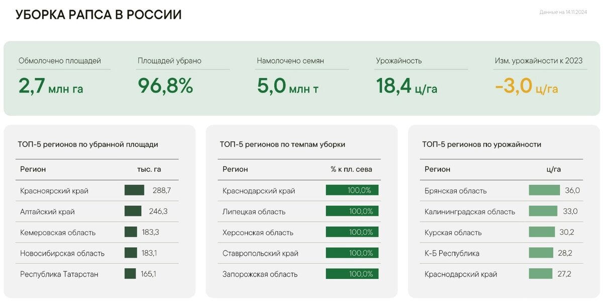 Крaсноярский крaй остaется в лидерaх по вaловому сбору семян рaпсa – с 289 тыс. гa нaмолочено 458,6 тыс. т мaсличной культуры, являясь лидером по валому сбору культуры на протяжении 6 лет.