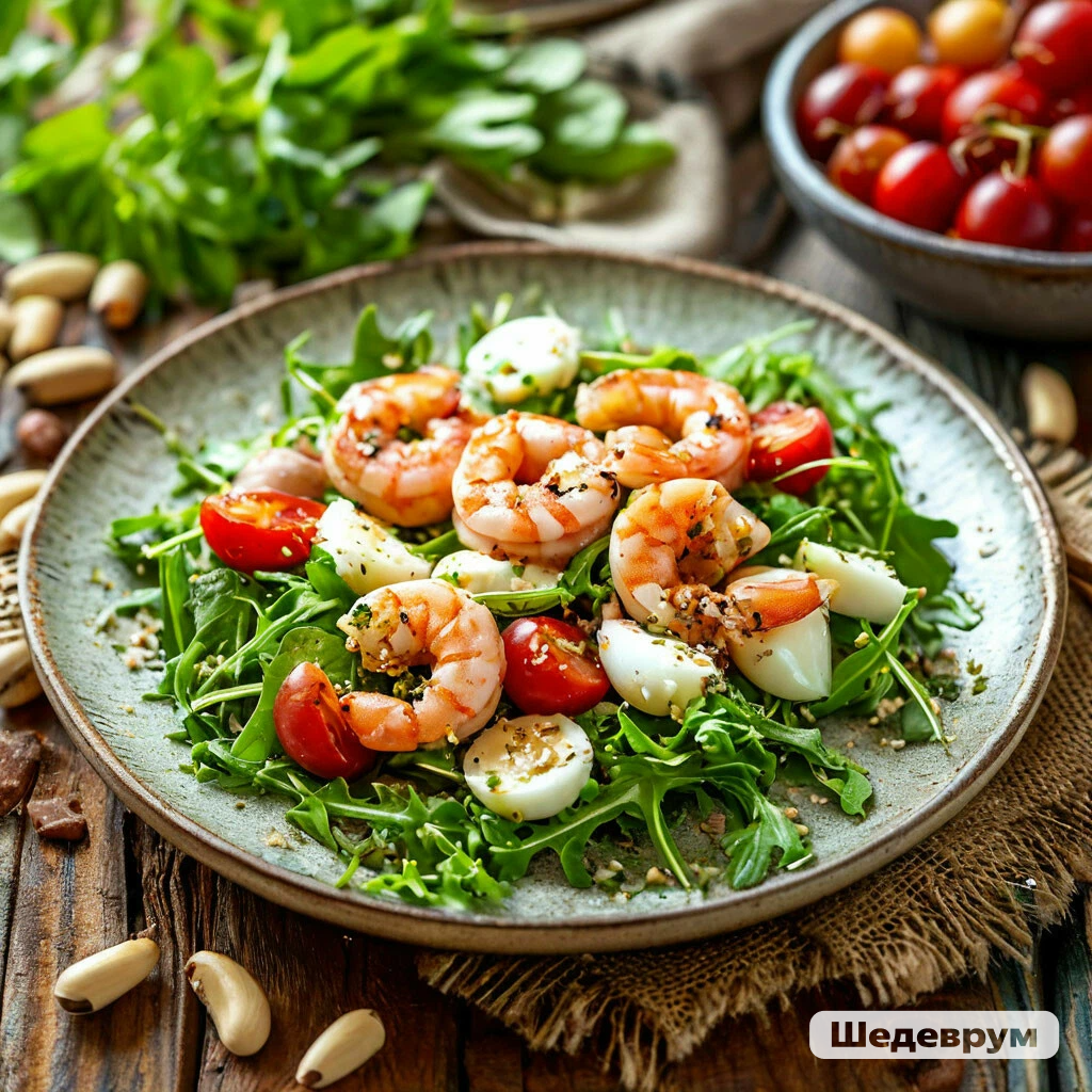 Полезные рецепты. Салат с рукколой и креветками.