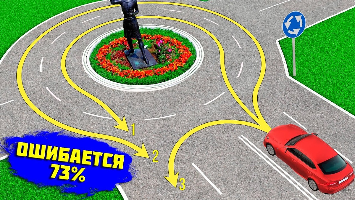Всем привет, уважаемые автолюбители! Мы продолжаем серию разборов интересных дорожных ситуаций. Мы уже разобрали с вами не одну задачу с круговыми перекрёстками. А сегодня я подготовил для вас более сложную ситуацию, связанную с проездом перекрёстка с круговым движением. Предварительный опрос по данной задаче показал, что 73% опрошенных не смогли правильно её решить. Предварительные опросы я провожу в своём Telegram-канале, там регулярно выходят новые и, главное, оригинальные задачи на тему ПДД. Подписывайтесь и решайте задачи вместе! А в данной задаче необходимо выяснить, По какой траектории разрешено выполнить разворот на круговом перекрёстке. На выбор представлены следующие варианты ответа: Правильный ответ вы найдете после разбора задачи, но не спешите в него подглядывать. Попробуйте самостоятельно решить задачу, а лишь потом сверяйтесь с правильным ответом. На картинке с заданием мы видим красный легковой автомобиль у кругового перекрёстка. Водитель легковушки намерен выполнить р