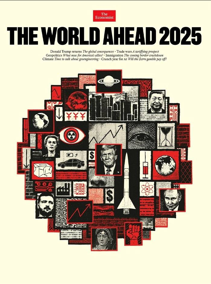 Мелкобританский The Economist представил обложку - ребус на 2025 год, полную намёков на Апокалипсис. Главный предвестник Апокалипсиса по мнению рупора либералов и глобалистов (в частности Ротшильдов) - Трамп, находящийся в центре мрачной композиции.