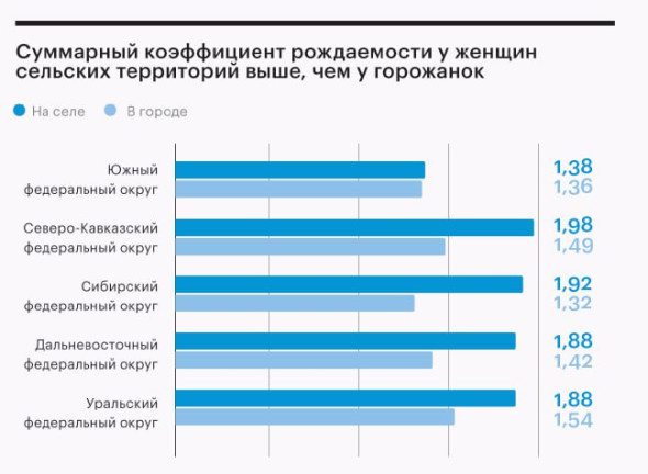Исследование РСХБ показало, что индекс рождаемости в российских селах выше, чем в городах в пяти федеральных округах — Южном, Северо-Кавказском, Сибирском, Дальневосточном и Уральском. В десяти регионах России, по оценкам аналитиков, к 2030 году сельское население может увеличиться на 6,4%.
