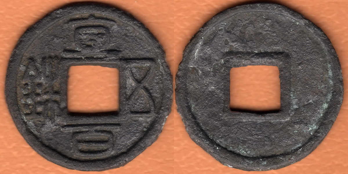 100 монет учжу 214 – 234 годов (19 год Цзяньань – 12 год Цзяньсин / 建安19年–建興12年), отлита в правление Чжаоле-ди Лю Бэя (Zhāolièdì Liú Bèi 昭烈帝劉備) и Хуай-ди Лю Шаня (Huáidì Líu Shàn 懷帝劉禪).