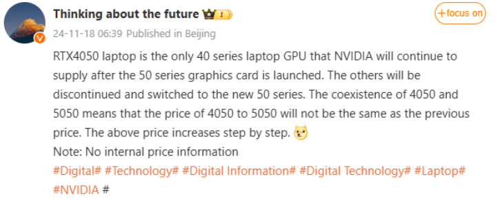 Мобильная карта GeForce RTX 4050 останется в продаже даже после запуска серии RTX 50