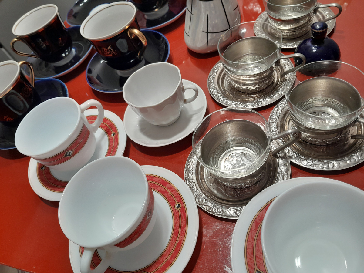Наверное, это была самая глупая покупка из всех. Но интересно ваше мнение 🌺. Во время последней поездки в Санкт-Петербург мы проехались по трём адресам и купили посуду по объявлениям с Авито. Почти всё уже показала, вот теперь показываю мешок посуды за 1600. На случай, если пропустили. Тут показывала мешок посуды за 500 рублей: Тут за 600: А тут "кота в мешке" за 400: Сначала всё, что сегодня покажу, стоило 1800 рублей. Но мы договорились о 1600 рублях, иначе даже не поехали бы. Посуду продавала дочка, а ехать за посудой надо было к её маме, уже бабушке старенькой. Ехать пришлось в самый центр, ещё и 100 рублей за парковку платить. Так что даже не 1600 потратили, а 1700 рублей. Так-с. Четыре вот таких кофейных пары. МНЦ. Даже фактически тройки - блюдечко, подстаканник и стеклянная вставка. Красивые. У нас своих таких из наследства 7 штук (плюс восьмую продали), теперь у нас их 11😄. Штоф Гусь. Без пробки и с одной только стопкой. Три чайных пары Довбышевского завода. Точнее, их было