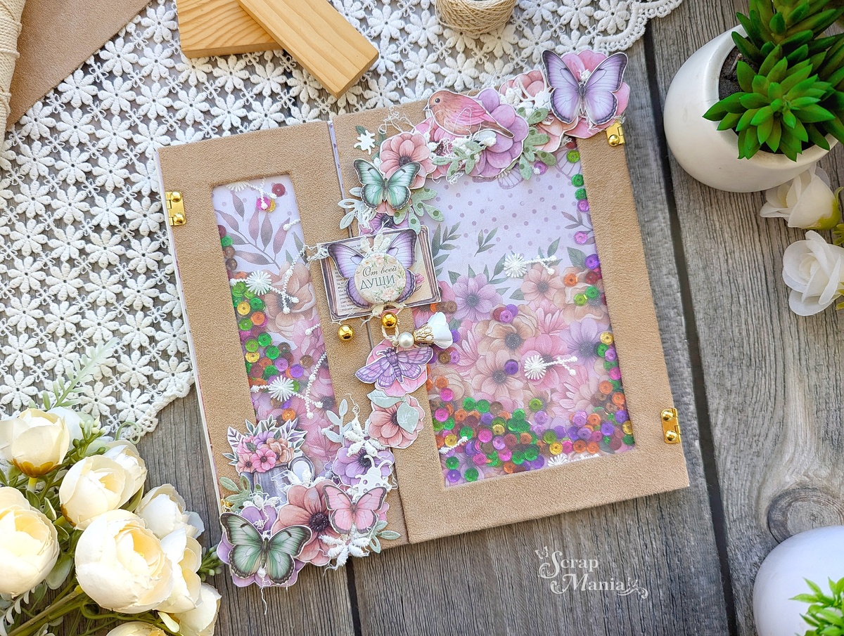 Всем привет, с вами Катрин Гредасова. На дворе уже давно не лето, но так хочется его вспомнить и вновь ощутить. Для этого я выбрала потрясающую коллекцию «Летние бабочки». И я создала яркую фотопапку, которая наполнена летом, радостью и теплом. Я решила оформить её как двери, открывающие нам краски прошедшего лета. Рамки я сделала из переплетного картона и обтянула их нежной бежевой замшей. Прикрепила мини-петли и ручки из брадс с большой шляпкой. Двери я сделала по принципу шейкера, только вместо плёнки использовала нежную сетку. А внутрь поместила разноцветные пайетки, они создадут атмосферу праздничных сюрпризов, которые нам ещё предстоит пережить. На декор у меня пошли почти все вырезалки. Использовала Лист с картинками 10х30 см "Летние бабочки. Цветы", Лист с картинками 10х30 см "Летние бабочки. Бабочки", Лист с картинками 10х30 см "Летние бабочки. Детали". Под сеткой спряталась яркая цветочная полянка из листа бумага "Летние бабочки. Момент". Не обошлось без вырубки листиков из