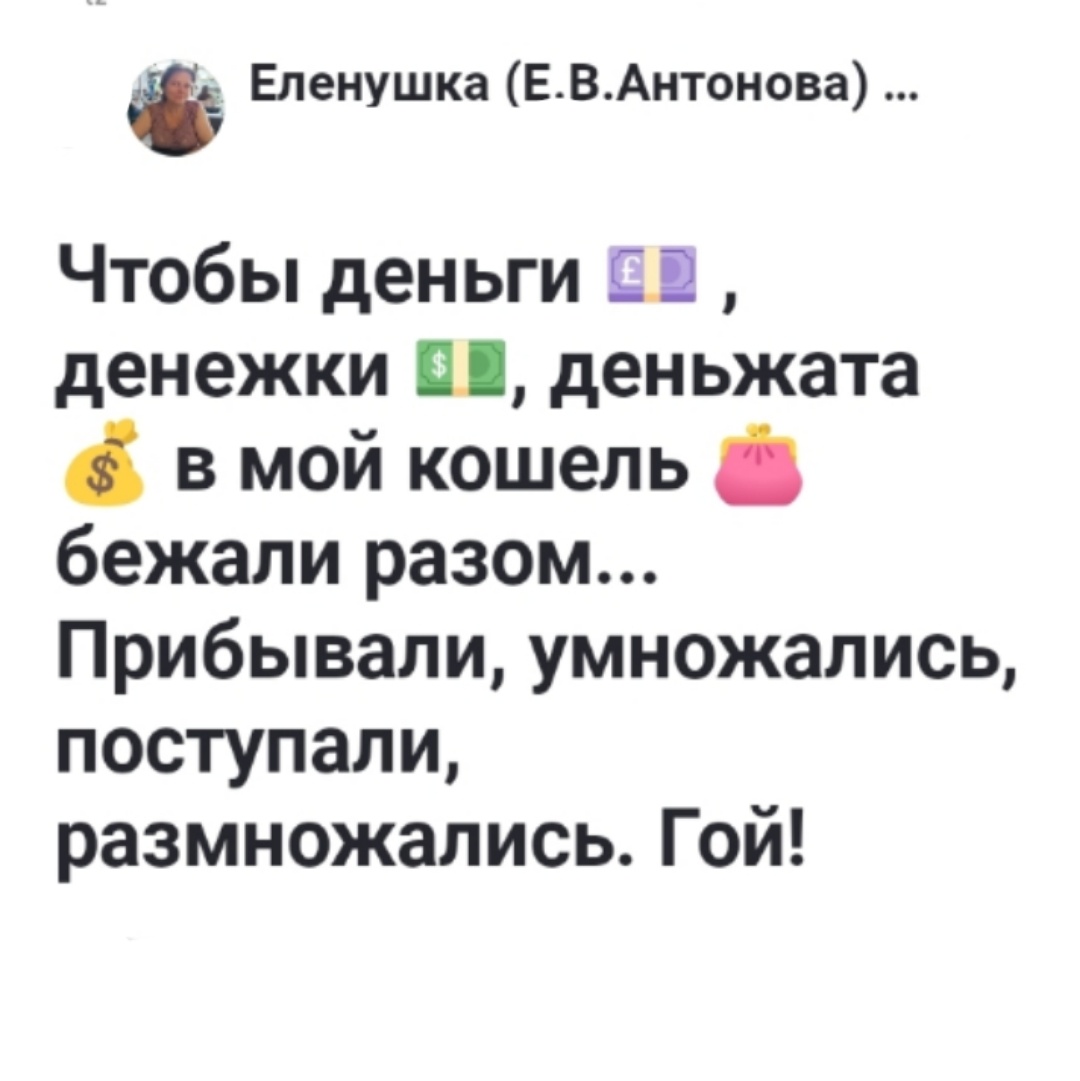 Чтобы деньги 💷 , денежки 💵, деньжата 💰 в мой кошель 👛 бежали разом... Прибывали, умножались, поступали, размножались. Гой!