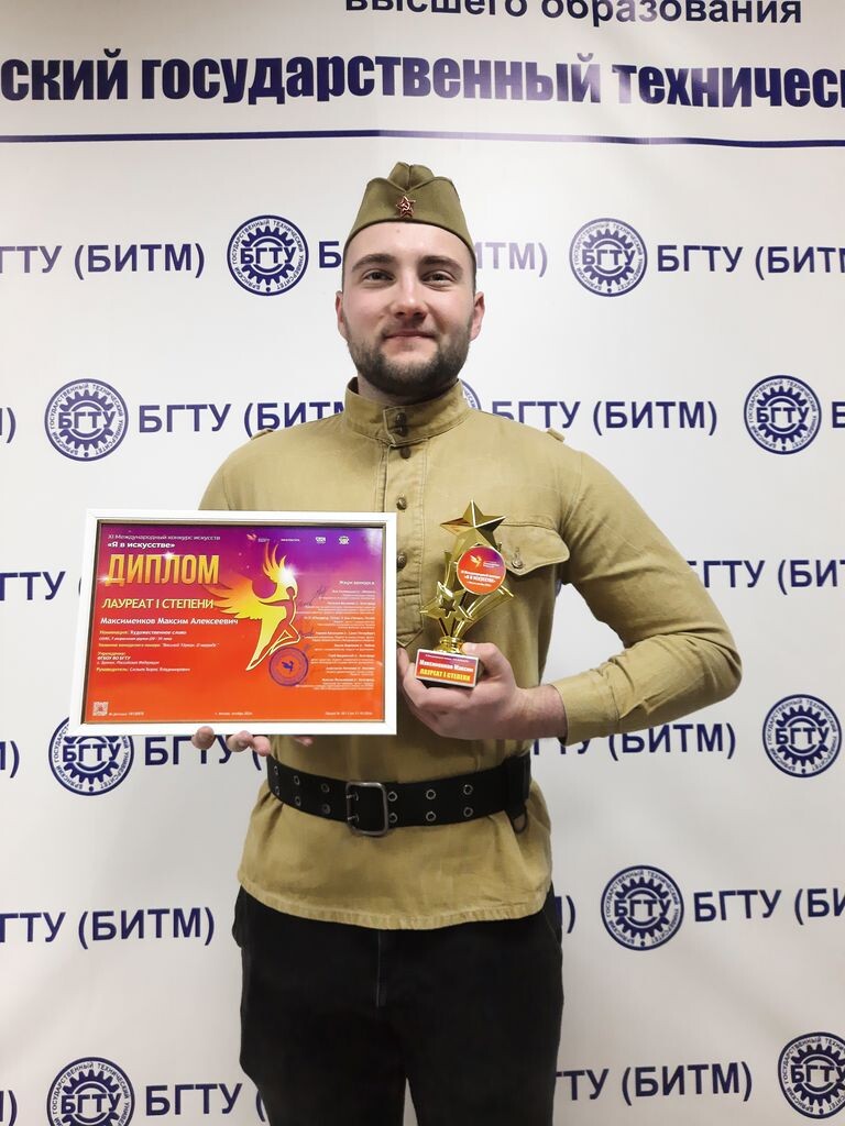 Участник СТЭМа «ПУМ-ПУ-ROOM51» Брянского государственного технического университета (БГТУ) Максим Максименков принял участие в XI Международном конкурсе искусств «Я в ИСКУССТВЕ», который проводился при информационной поддержке: Министерства культуры и архивного дела Сахалинской области; Министерства культуры Камчатского края; Министерства культуры Республики Ингушетия; Департамента культуры Орловской области; Министерства культуры, национальной политики и архивного дела Республики Мордовия; Гуманитарно-педагогической академии (филиала) ФГАОУ ВО «Крымский федеральный университет имени В.И. Вернадского» (г. Ялта); Государственного портала культурного наследия России PROКультура.РФ; Международного форума композиторов и поэтов-песенников (г. Москва). Учредитель и организатор конкурса Творческое объединение «Возрождение искусств». Максим Максименков на данный момент самый опытный участник СТЭМа БГТУ. Представляя на конкурсах родной вуз делает всё возможное, чтобы его выступления шли от само