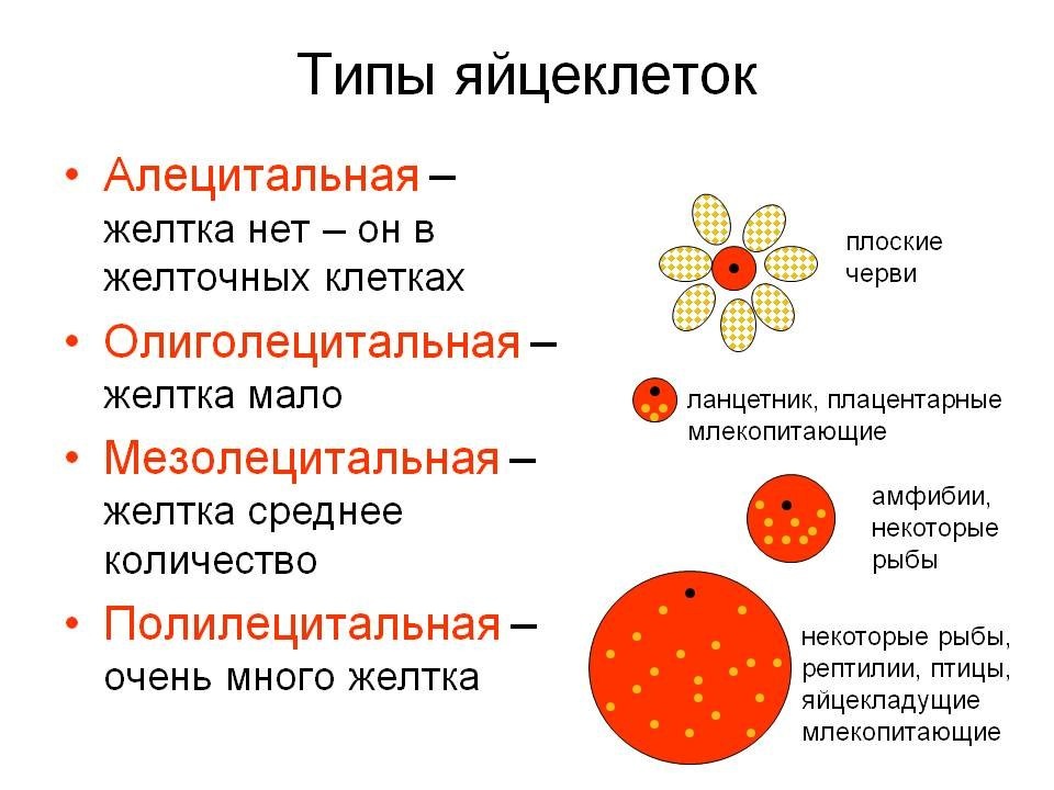 Яйцеклетки различных животных отличаются количеством желтка и количеством распределения цитоплазмы.