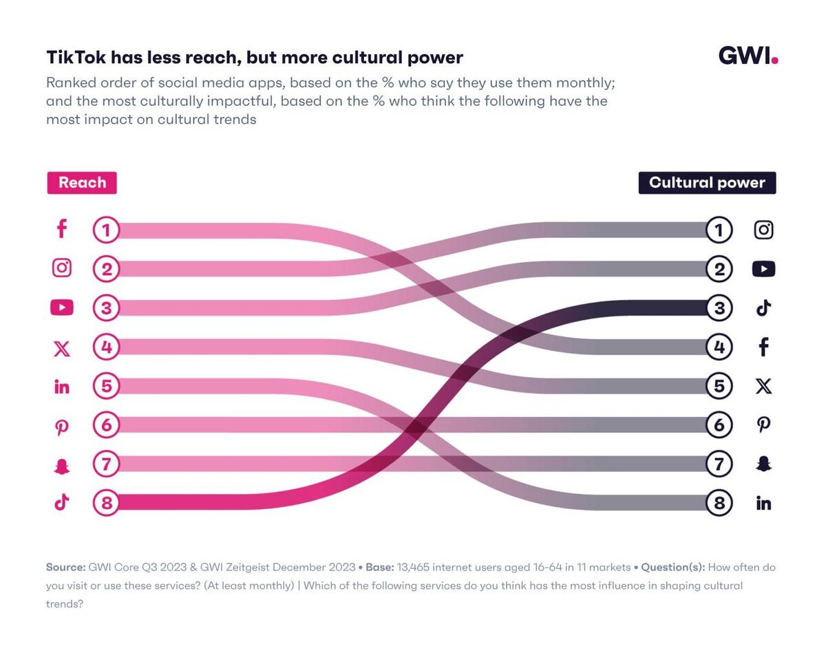 Короткие видео действительно меняют способы взаимодействия брендов с аудиторией и трансформируют поведение пользователей. Мы уже обсуждали тренд-репорт от OKCOOL, где прозвучал ценный инсайт: Gen-Z использует TikTok не только для развлечения, но и для поиска информации. Сегодня обратим внимание на исследование от GWI, которое добавляет ещё одну важную деталь: TikTok демонстрирует минимальный охват среди социальных сетей, но при этом входит в топ-3 по культурному влиянию! Речь здесь идёт уже не только о Gen-Z: на самом деле, средний возраст пользователя TikTok всего на 1–2 года выше, чем у Instagram, и лишь на год ниже, чем у Facebook, который принято считать последним оплотом бумеров. Мы говорим о диапазоне 34–36 лет — то есть средний пользователь любой из этих платформ на деле оказывается миллениалом! И вообще, возраст — далеко не единственный показатель. Более того, скорее, совсем нерелевантный, так как внимание стоит обратить на топ-3 платформ. В этот топ, помимо TikTok, входят Inst
