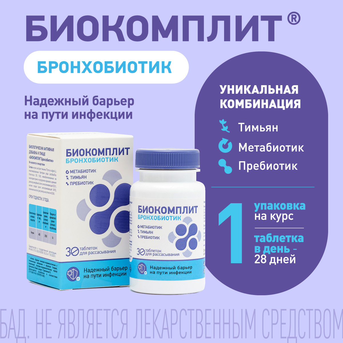 Биокомплит Бронхобиотик помогает бороться с сезонными инфекциями и поддерживать иммунитет. В 2023 году была опубликована статья по эффективности компонентов данного продукта в журнале «Медицинский алфавит» (Барышникова Н.В. Эффективность метабиотиков в лечении острых респираторных заболеваний. Медицинский алфавит. 2023;(26):13-20. https://doi.org/10.33667/2078-5631-2023-26-13-20).
