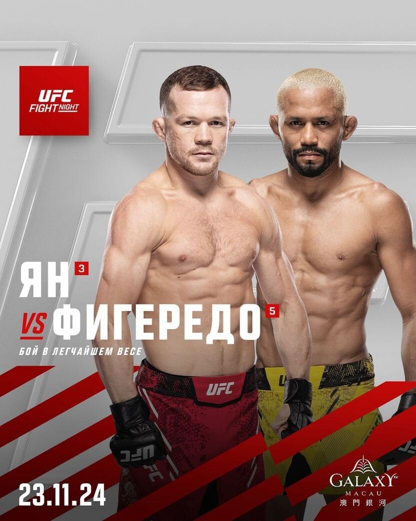 Поединок Ян — Фигередо пройдет в Макао на турнире UFC Fight Night в эту субботу, 23 ноября. Начало турнира запланировано на 11:00 по московскому времени, главный кард начнется в 14:00. Ориентировочное время начала боя Петра Яна и Дейвесона Фигередо — не раньше 15:00. Сильные стороны Петра Яна 1. Базовый бокс и ударная техника: Петру свойственна выдающаяся техника бокса, разнообразные комбинации и точность в ударах. Он может перехватывать инициативу благодаря джебам и силовым ударам. 2. Кардио и давление: Ян умеет работать в высоком темпе на протяжении всего боя, постепенно изматывая соперников. 3. Умение адаптироваться: Петр великолепно читает соперника по ходу боя и перестраивает свою тактику, как это было в поединках с Сэндхагеном и Риверой. 4. Защита от тейкдаунов: Его навыки в защите от переводов на уровень элитного уровня, что позволяет ему удерживать бой в стойке. 5. Контроль дистанции: Ян мастерски чувствует дистанцию, что помогает ему избегать опасных атак соперника и до