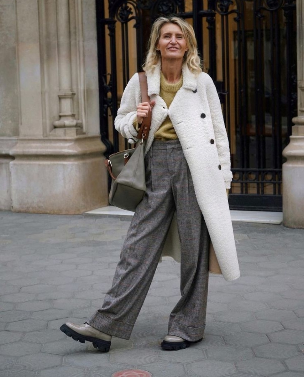 Пальто с узором делает образ игривым и оригинальным. А бежевые брюки создают базу для яркой верхней одежды и эффектных аксессуаров. Они могут быть как классическими, так и более свободными.