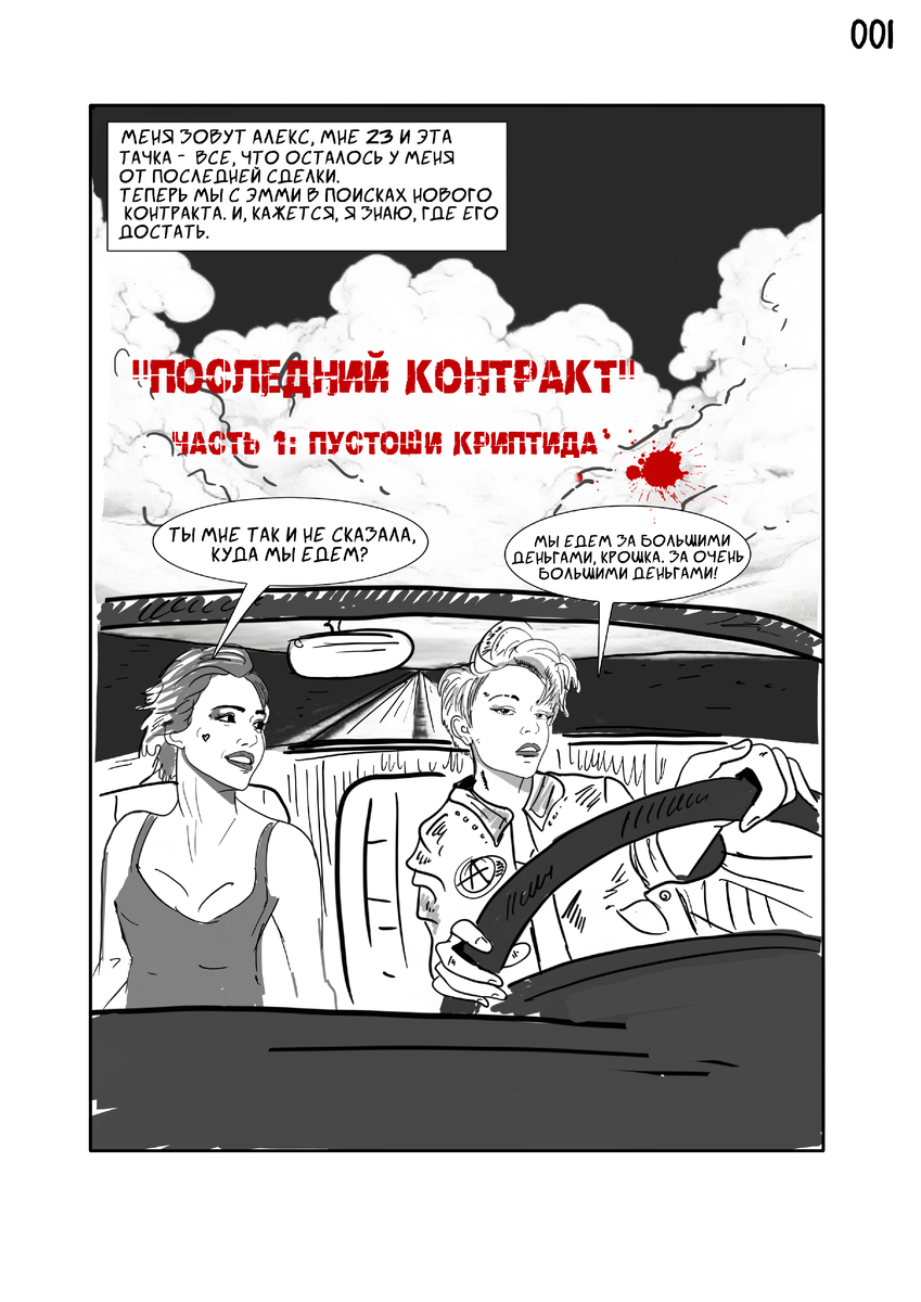 Однажды мне приснилось жуткое существо — антропоморфный криптид, похожий на гигантскую черную слизь с когтистыми руками. Он стоял над моей кроватью, словно тень, и смотрел на меня, спящего. От него исходили ужасные низкочастотные вибрации, которые заставляли меня покрываться мурашками и липким потом как снаружи, так и изнутри. Чудовище тянуло ко мне свои мерзкие лапы, пытаясь нащупать артерию на моей шее. Но вдруг! Внезапно в моей голове вспыхнула идея сценария для нового графического романа! Я вскочил с кровати и бросился рисовать. К сожалению, что стало с монстром, я уже не помню. А теперь к новой истории. ПОСЛЕДНИЙ КОНТРАКТ. ЧАСТЬ 1: ПУСТОШИ КРИПТИДА. Бескрайняя пустошь вызывала тревожные чувства. Ни единой души вокруг, лишь дорога, уходящая за горизонт. Алекс ощущала, что грядут перемены. Этот контракт обещал быть непростым, возможно, самым сложным в её карьере. В телефонном разговоре с Информатором она получила вводные данные, которые, с одной стороны, не были для неё неожиданными