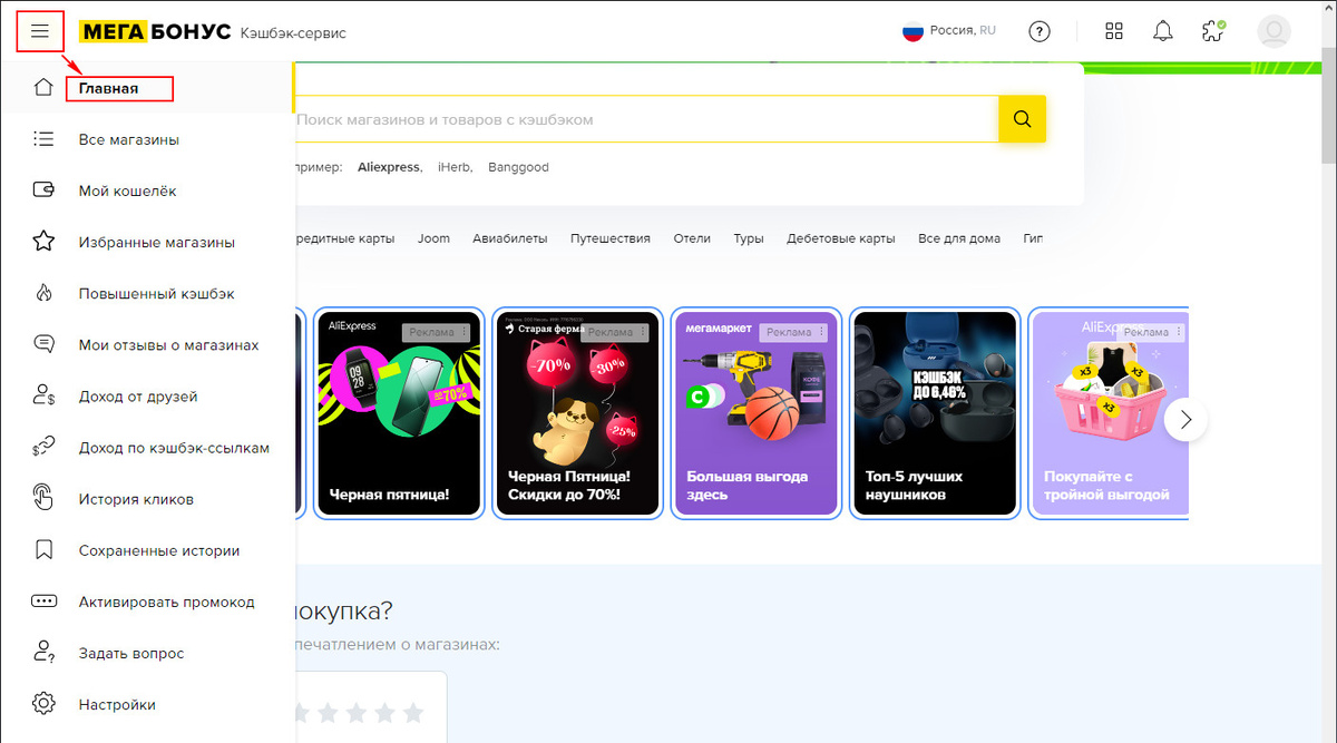 Сейчас действует скрытая акция от Сбербанка - за оформление кредитной карты с бесплатным обслуживанием Вы можете получить 3000+ рублей. Важно сразу отметить особенно, что кредитка Сбера без оплаты за обслуживание, так что Вы ее даже можете не использовать после получения. А получить 3000 рублей сможете))) Действий действительно на 15 минут ради того, чтобы заработать 3000 рублей. Но, чтобы все получилось нужна "связка" двух сайтов. Итак, перейдем к делу. Первый - это сайт МЕГАбонус, специализирующийся уже много лет на кэшбеке за покупки в интернете - и очень успешно. Регистрируемся на главной странице сайта МЕГАбонус. Можно даже не устанавливать расширение. Но все же на всякий случай рекомендуется установить. В личном кабинете есть все соответствующие указания и руководства, так что даже малопонимающий пользователь справится с этой задачей. В главном меню (три полоски в правом верхнем углу) переходим по ссылке "Главная": Далее в поисковой строке начинаем вводить: "Сбербанк: Кредитная