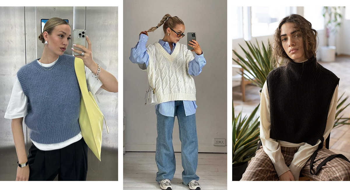 Вязаные жилеты с треугольным вырезом хорошо сочетаются с классическими блузками, а модели с круглым воротом — с футболками. В тренде и жилеты с высоким объемным воротником. Они отлично защищают от холода и могут заменить шарф.