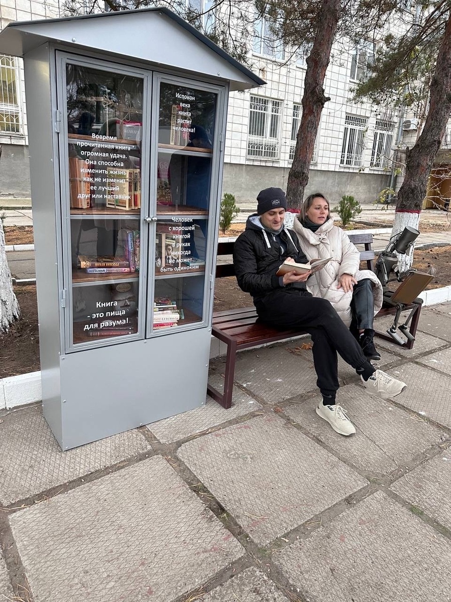 В Волгограде на территории Сельскохозяйственного института группа активистов установила шкаф для обмена книгами, лавочку и читающего робота.
