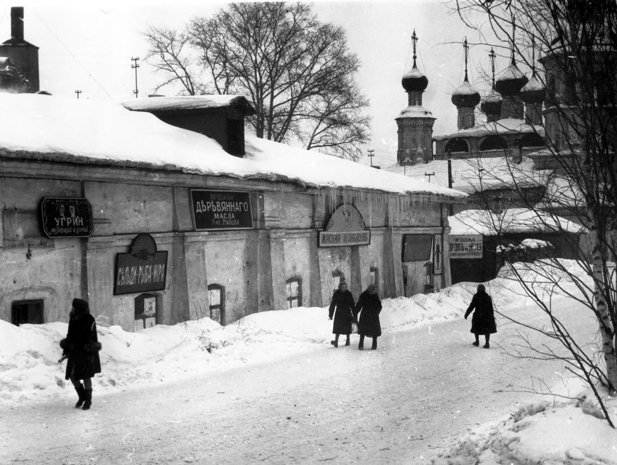 Первый снимок сделан зимой в начале 1966 года. Дореволюционные вывески на здании бани №2 на современной Набережной 6 Армии у Октябрьского моста смотрятся забавно, если знать, что это бани. Развесили эти рекламные вывески на фасаде киношники, которые в это время снимали фильм "Дядюшкин сон".
