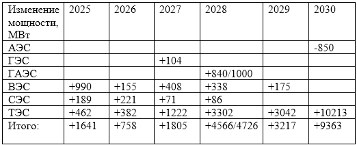Сведём данные по изменению мощности АЭС, ГЭС, ГАЭС, ВЭС, СЭС и ТЭС за период до 2031 года (одну шестилетку) в одну таблицу: Из этой таблицы видно, что основной прирост мощности электростанций единой энергетической системы (ЕЭС) РФ запланирован на 2030 год. Много это или мало? Достаточно ли этих мощностей для надёжного энергоснабжения населения и промышленных предприятий? Оценим увеличение мощности ЕЭС РФ в процентах в ближайшую шестилетку по отношению к началу 2024 года. На 1 января 2024 года общая установленная мощность электростанций ЕЭС России составила 263,1 тыс. МВт. В таблице приведены данные по прогнозу увеличения установленной мощности крупных электростанций в % по отношению к началу 2024 года: Что можно сказать, глядя на эту таблицу, с учётом того, что для роста экономики требуются энергетические мощности? Экономисты оценивают ежегодный рост экономики России в ближайшие пять лет в 2%! Обеспечить рост экономики в 2% невозможно при ежегодном росте энергетических мощностей, котор