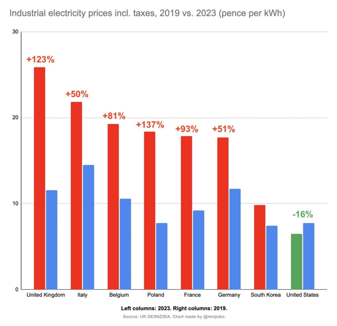 Многие аналитики признают, что экономический рост Германии во многом был обусловлен доступом к дешёвым энергоносителям и возможностью продавать продукцию на глобальном рынке без ограничений. Сегодня автомобили европейских брендов не могут похвастать рекордным спросом, ну а после введения санкций против России и подрыва Северных потоков возможность закупать газ по выгодной цене и вовсе пропала. Стоимость электричества постоянно растёт, но политика конфронтации способна привести к ещё более губительным последствиям. На графике можно увидеть, что в нескольких крупных экономиках Европы стоимость 1 кВт*ч уже стала в 2 раза дороже, чем в 2019 году, ну а на кону стоят финансовые интересы крупных игроков. Ряд компаний уже заявили, что будут сворачивать производство в Европе, а особенно тревожными кажутся высказывания руководства Volkswagen.