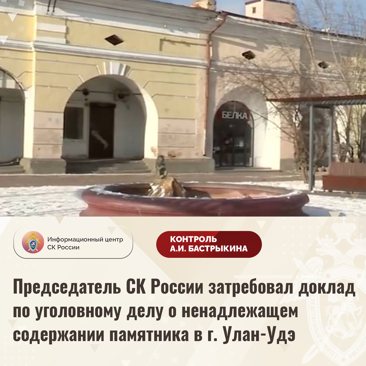 Председатель СК России затребовал доклад по уголовному делу о ненадлежащем содержании памятника в г. Улан-Удэ Внимание Председателя СК России А.И. Бастрыкина обращено на публикацию в СМИ о ненадлежащем содержании архитектурного памятника федерального значения - «Гостиного двора» в городе Улан-Удэ Республики Бурятии. Сооружение, XIX века постройки, несколько лет находится в ветхом состоянии: разрушаются стены и колонны, осыпается штукатурка. Мер к устранению нарушений не принимается. В СУ СК России по Республике Бурятии по данному факту возбуждено уголовное дело. Председатель Следственного комитета Российской Федерации Александр Иванович Бастрыкин затребовал у и.о. руководителя СУ СК России по Республике Бурятии Евгения Вячеславовича Лагацкого доклад об установленных в ходе первоначальных следственных действий обстоятельствах, а по завершении расследования – о его результатах. Исполнение поручения поставлено на контроль в центральном аппарате ведомства. #СледственныйКомитет #СКРоссии #С
