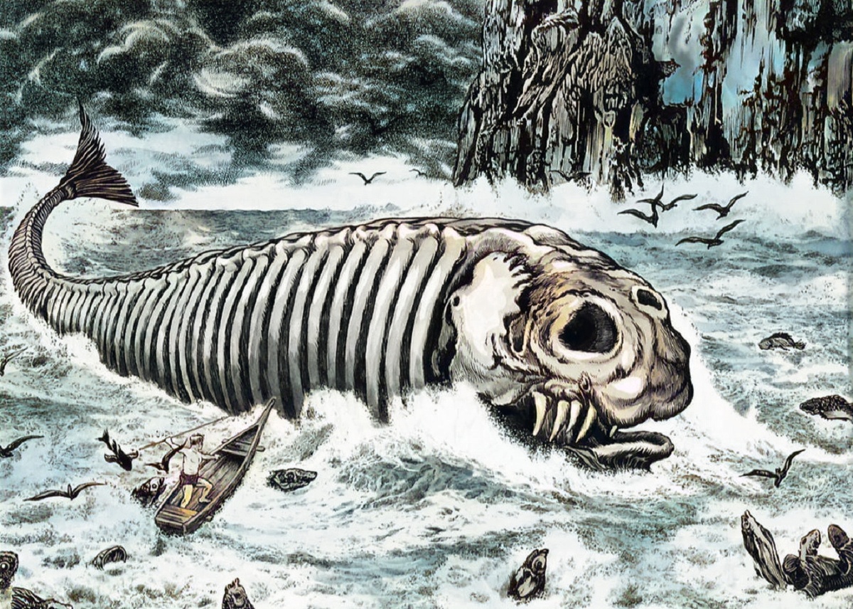 Бакэ-кудзира (化鯨, буквально «призрачный кит») — один из самых мрачных и символичных персонажей японской мифологии. Этот мифический дух воплощает связь между человеком и природой, а также напоминает о последствиях жадности и жестокости. Бакэ-кудзира выглядит как гигантский скелет кита, плавающий у поверхности воды. Его пустые глазницы и массивные костные обломки производят жуткое впечатление. Часто он появляется вместе со стаями странных птиц или фантастических рыб, которые сопровождают его. Эти существа также кажутся призрачными и ведут себя необычно. Бакэ-кудзира связан с дождливыми ночами и грозами, обычно проявляясь в тихих рыбачьих деревнях. Рыбаки, заметившие его, считают, что это предвестник бедствий — болезней, неурожаев или штормов. Согласно преданиям, когда китобои убивают кита, они часто забывают проявить уважение к его духу. В одном из таких случаев жадные охотники уничтожили кита в священных водах, которые считались местом, охраняемым богами. Кит был убит ради наживы, и ни