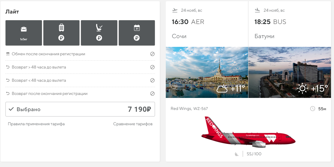 Мы же приобрели авиабилеты компании Nordwind, с которым летим из Оренбурга в Сочи, а также Red Wings, с которым летим из Сочи в Батуми и из Тбилиси в Самару.